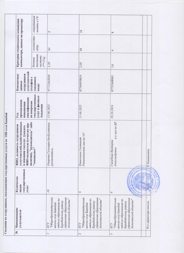 2025 жылдың қазан айына Баянбай ауылындағы орта мектепте мемлекеттік қызмет көрсететін қызметкерлер туралы ақпарат.