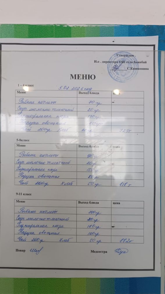 Мәзір « 05.02. 2026 ж» 1-4 сынып оқушылары үшін