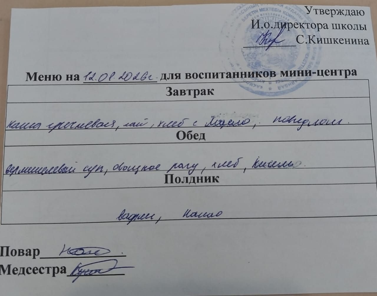 "Жұлдызай" шағын орталығының "12.01.2026 ж" мәзірі