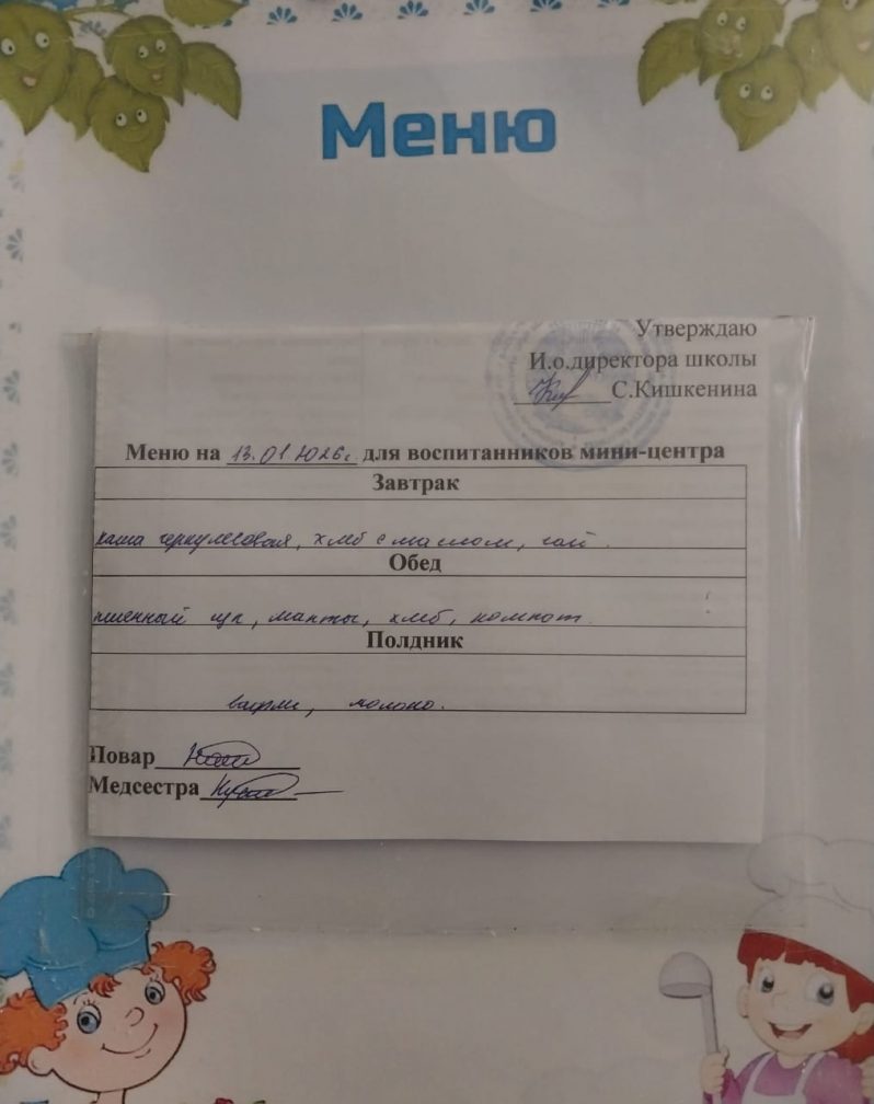 "Жұлдызай" шағын орталығының "13.01.2026 ж" мәзірі