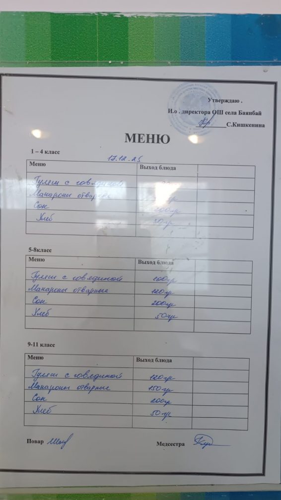 Мәзір « 17.12. 2024 ж» 1-4 сынып оқушылары үшін