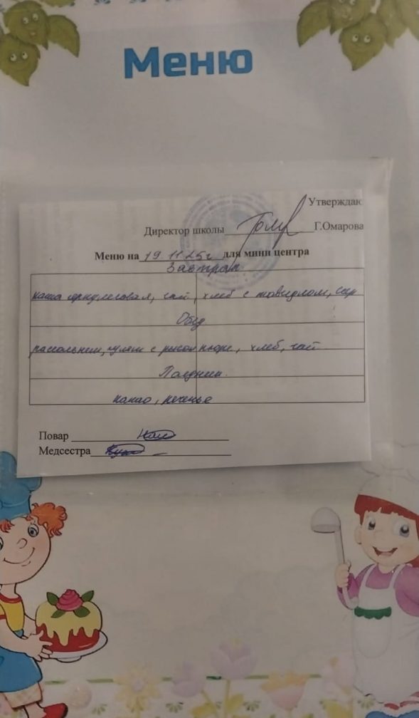 "Жұлдызай" шағын орталығының "19.11.2025 ж" мәзірі