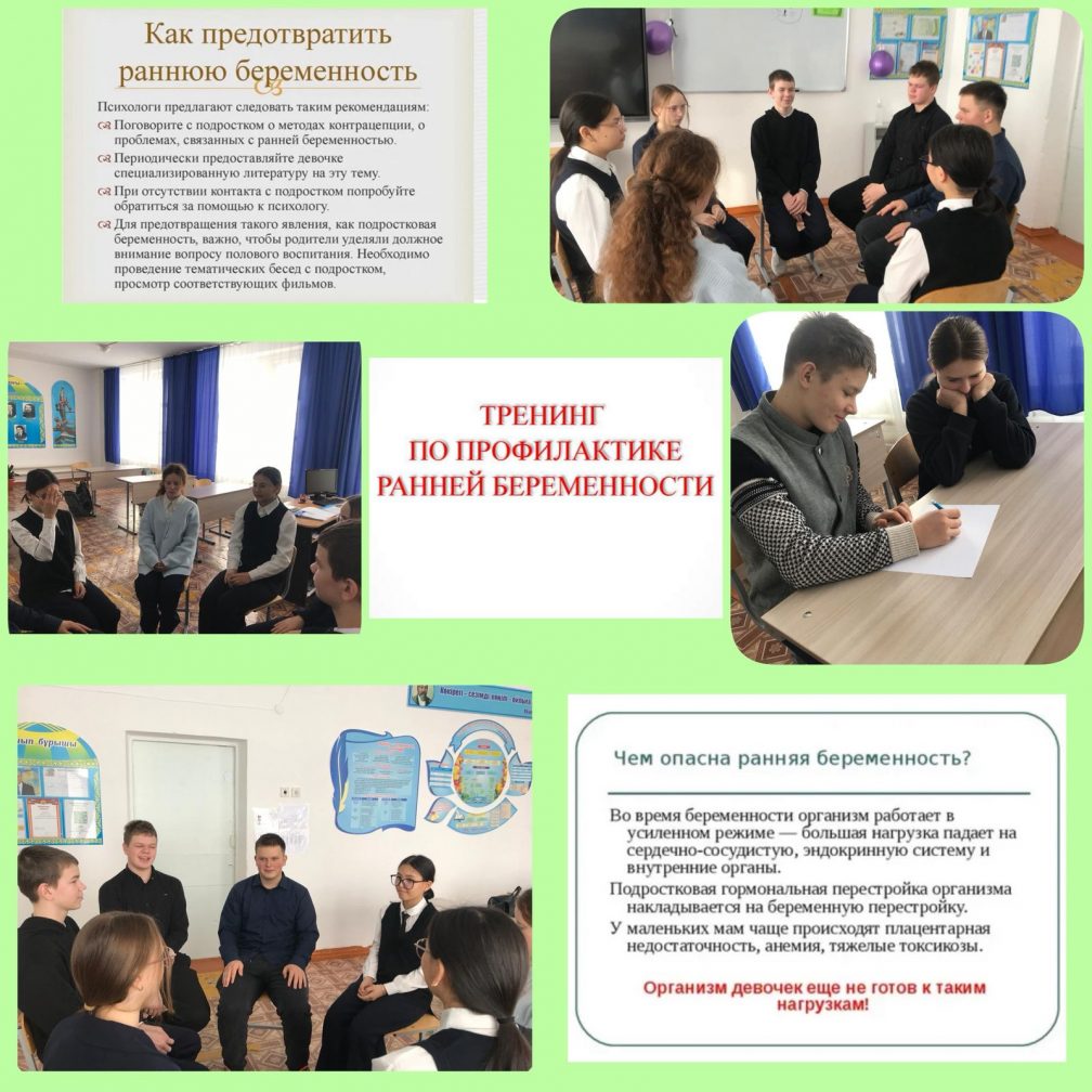 «Ерте жүктіліктің алдын алу» 8 және 9 сынып оқушылары арасында «Ерте жүктіліктің алдын алу» тақырыбында тренинг сабағы өткізілді. Жүктіліктің ерте алдын алудың мақсаты – жасөспірімдердің жүктілігінің жиілігін азайту және жасөспірімдерге гигиена туралы білім мен дағдыларды сіңіру. Салауатты өмір салтын насихаттау. Педагог психолог: Ғ.Ж. Ахметова
